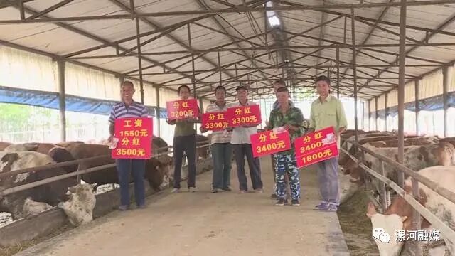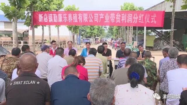 6月19日上午在新店镇齐罗村,勤康乐养殖有限公司产业带贫利润分红仪式举行。贫困户通过利用扶贫小额贷款认购肉牛、企业免费代养、保险担保的方式获得了不同额度的收益,现场第一批十名贫困户分别领取了3200—5000元不等的利润分红。同时,在养殖场务工的贫困户也领到了当月的工资收入。