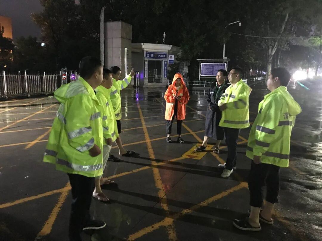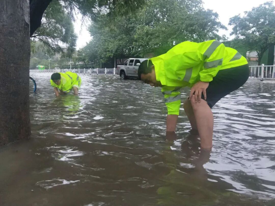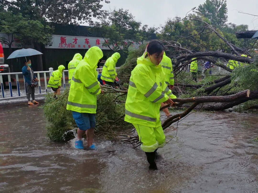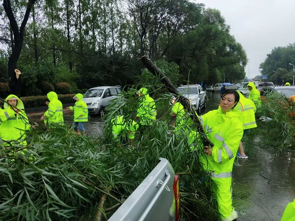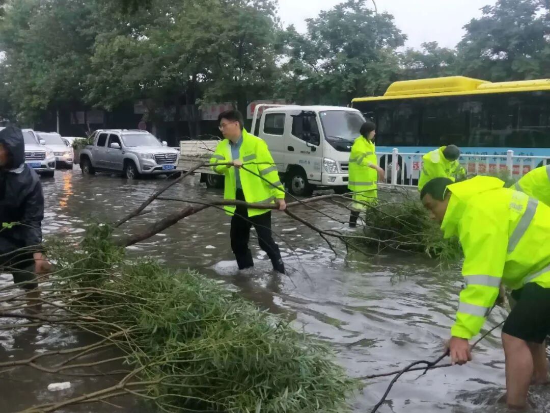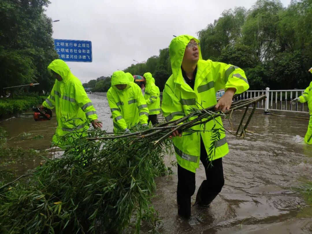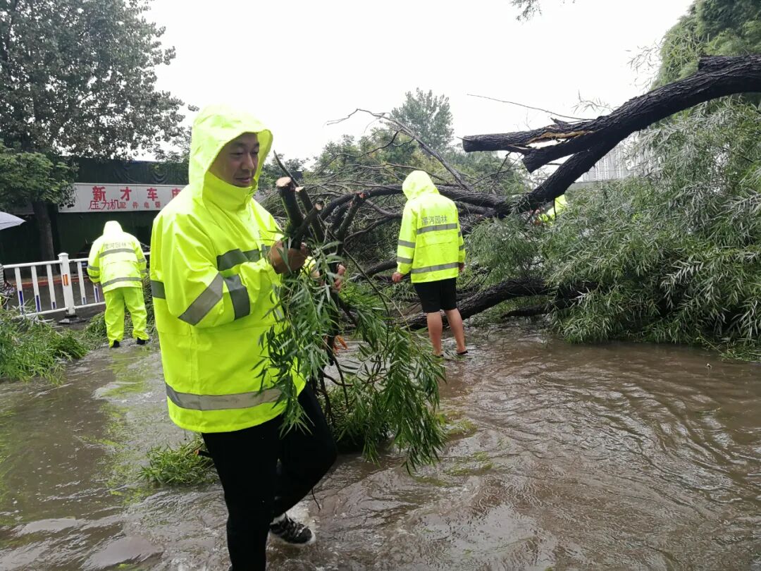 在人们望雨兴叹,感慨风雨无情之际,园林人上下齐心,全员上阵,顶风冒雨奔波在街头巷尾,他们分批、分组赶赴各个路段险情现场,奋战在滂沱大雨中。