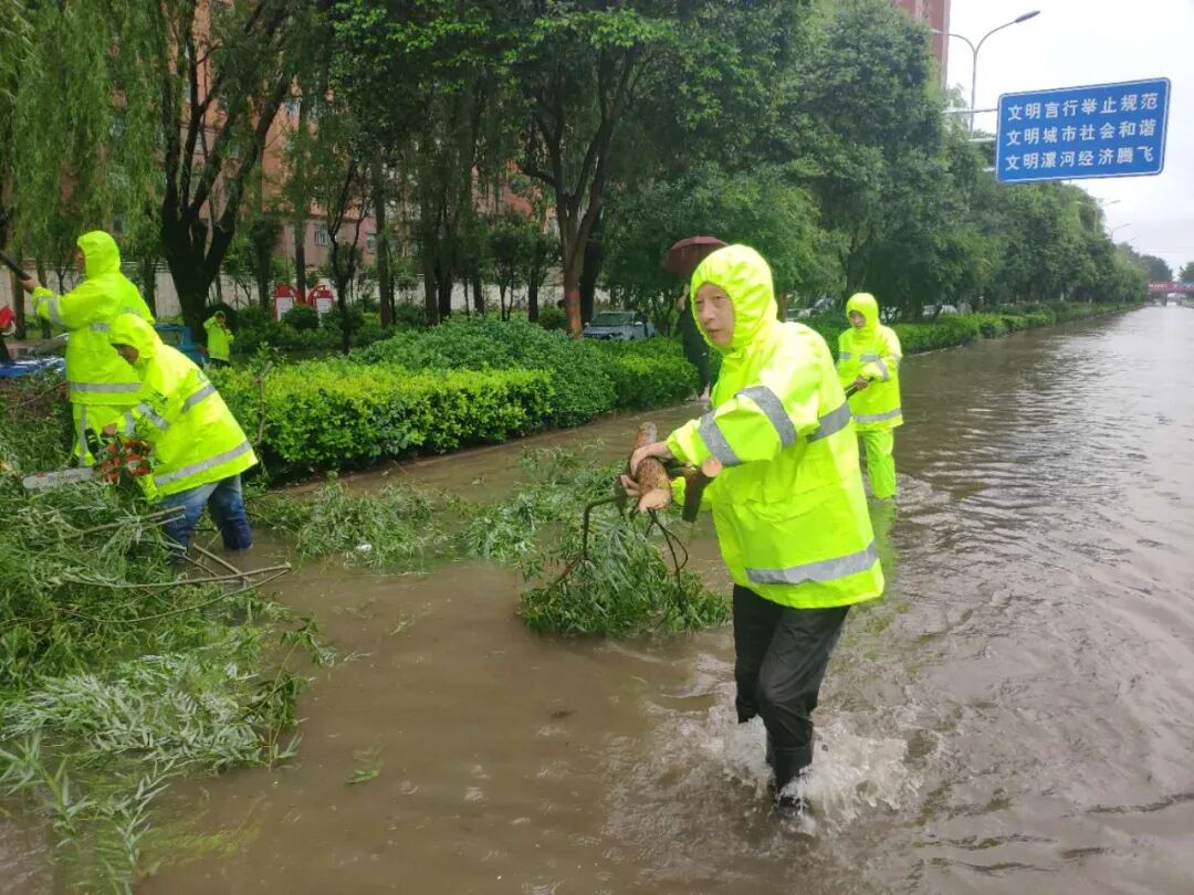 尽管他们都穿着雨衣,但个个浑身湿透。风雨中,我们看到了不屈不挠、不畏艰难、齐心合力、攻坚破难的最美画面。他们用坚实的臂膀守护漯河园林绿化的安全,他们用心筑起一道防汛墙,守护着我们美丽的家园。