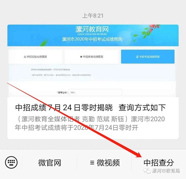(漯河教育全媒体记者 克勤 范斌 斯钰)漯河市2020年中招考试成绩将于2020年7月24日零时开通查询,关注漯河市教育局、漯河教育电视官方微信公众号,点击公众号右下角中招查分菜单(如图所示),输入准考证号和身份证后6位即可查询。