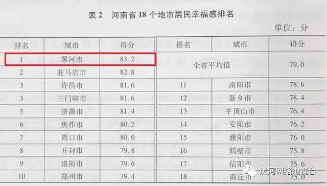 其中漯河以83.2分,守住了居民幸福感排行榜榜首的位置。