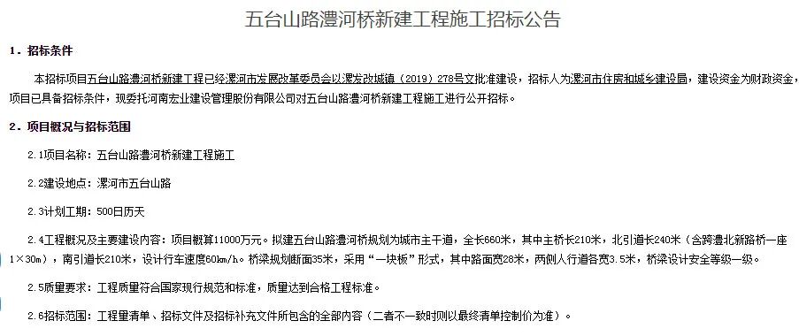 五台山路澧河桥新建工程已经漯河市发展改革委员会以漯发改城镇(2019)278号文批准建设,项目已具备招标条件。