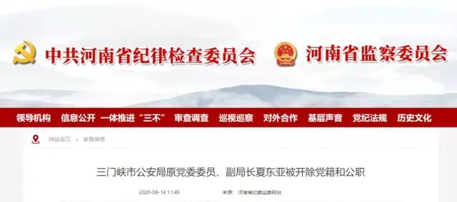 三门峡市公安局原党委委员、副局长夏东亚被开除党籍和公职