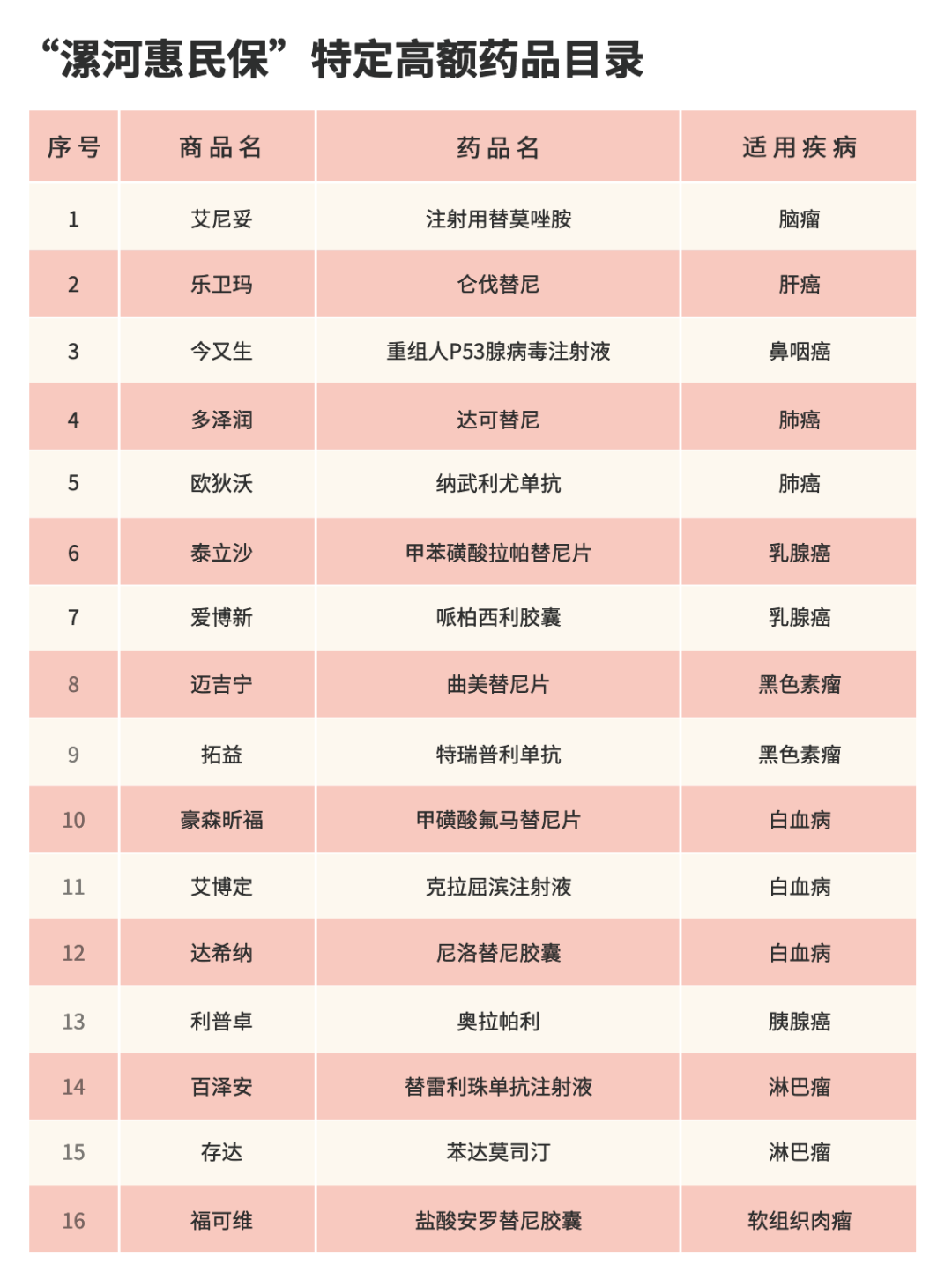 产品指定的特定高额药品目录,包含了治疗肺癌、肝癌、鼻咽癌、乳腺癌、白血病等恶性肿瘤的特效药。