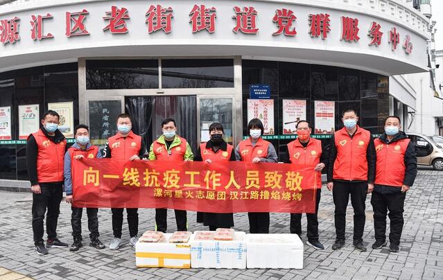 3月27日中午,漯河星火志愿团爱心商家撸焰大缸烧烤汉江路店负责人杨鹏带领员工,将270份盒饭送到源汇新区管委会,让他们把盒饭分发给在核酸检测采样点工作的医护人员和志愿者,以实际行动助力疫情防控。