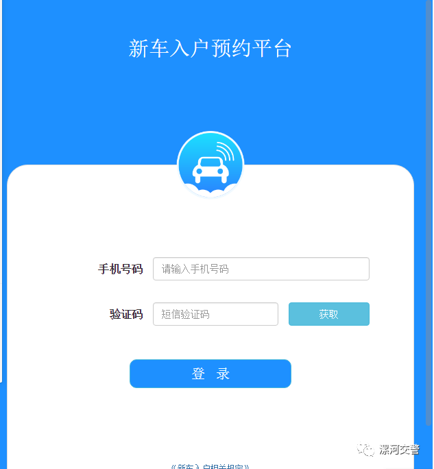 1、登录“新车入户预约平台” (clcy.lhjtglzd.gov.cn):输入车主手机号码、验证码进行登录。