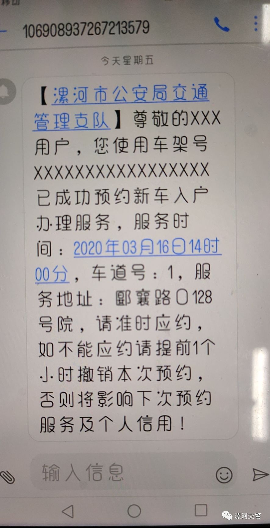 1、办理小型汽车新车注册登记业务必须通过“新车入户预约平台”(“漯河交警”微信公众号-自助服务-新车入户预约或者网址clcy.lhjtglzd.gov.cn)进行预约,办理大型汽车新车注册登记业务暂时不能在预约平台进行预约,可通过“微信预约平台”正常进行预约(已提前在全市运输公司微信群内通知),预约车辆必须在预约时间到预约地点办理,请勿提前太多到达,以免造成交通拥堵。未在预约时间达到预约地点的,预约作废。