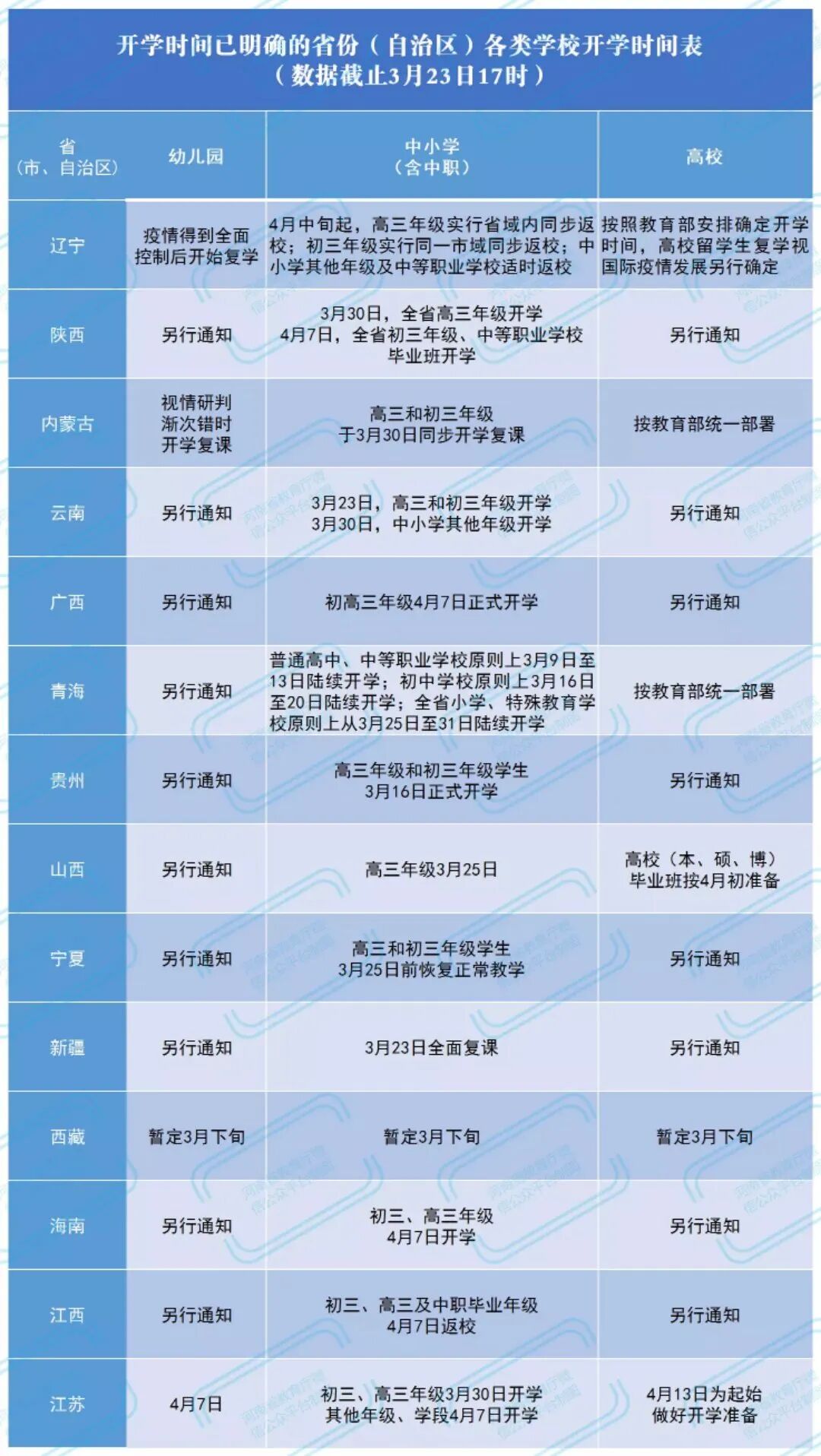 截至3月21日,江苏、江西、海南、陕西、山西、宁夏、青海、西藏、贵州、新疆、云南、广西、内蒙古、辽宁14个省(自治区)公布开学时间。