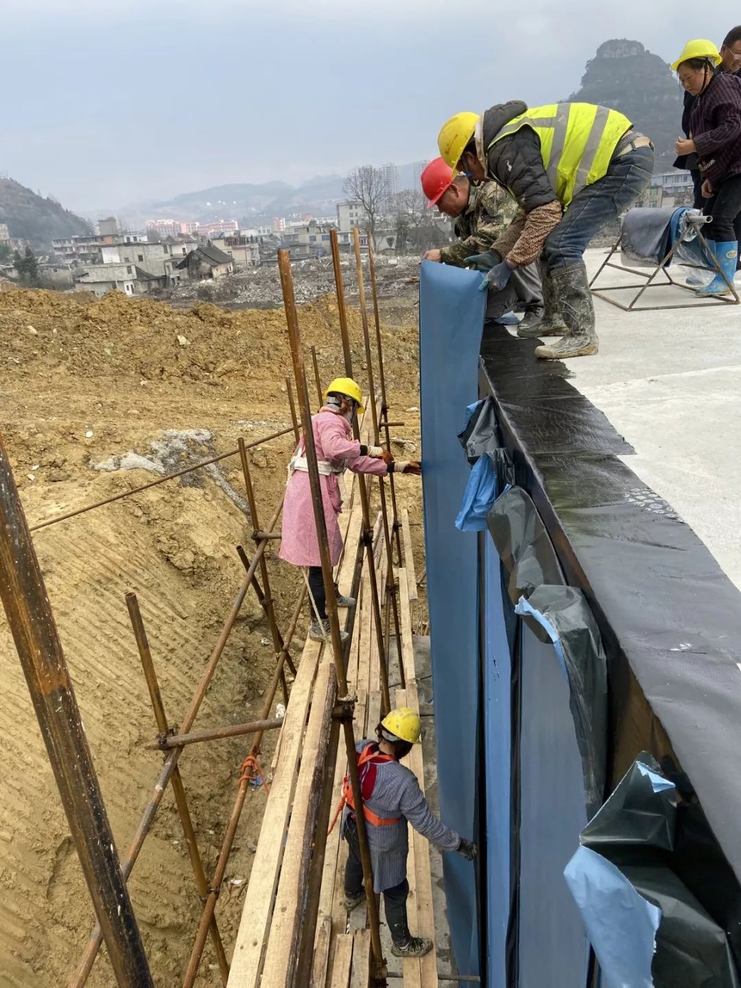 站台地下通道施工进入外墙防水材料铺设环节,由于高空作业,两组施工的工人身上均系着长长的安全绳,头上安全帽在阳光照射下折射出一道道鲜亮的光芒,形成了一道靓丽的风景线。