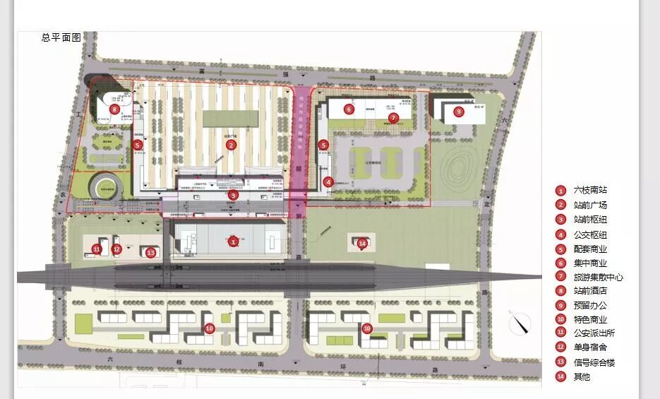 站前广场东侧为公交枢纽、旅游集散中心及商业,西侧为商业,北侧为站前规划路,南侧为换乘枢纽直接与六枝南站高铁站房连接,疏导进出站人流,组织有序换乘。