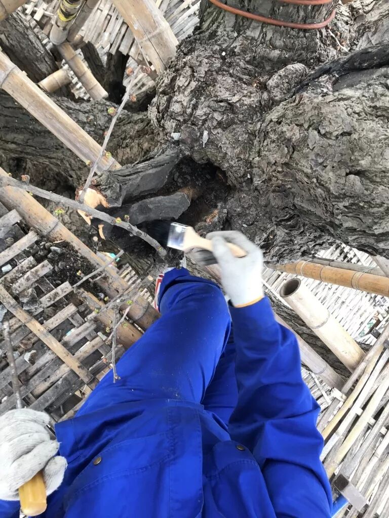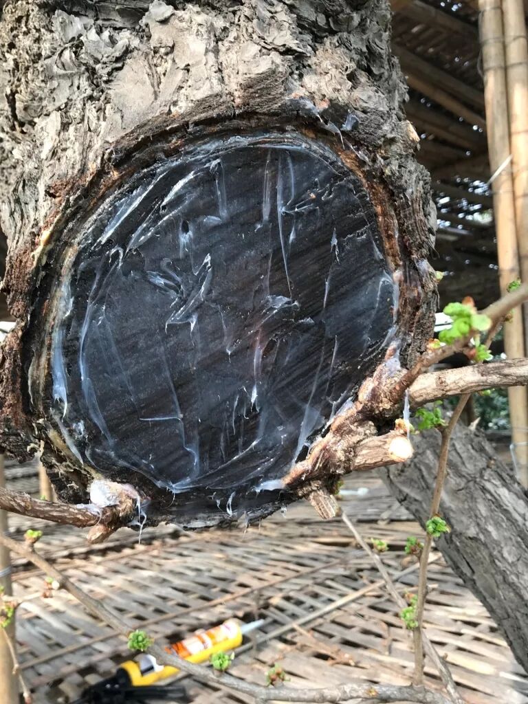 对新旧伤口、切口消毒处理,涂擦硅胶、桐油;对枝干上新老树洞清腐修补,保证干燥洁净,采用新型添补材料,发泡剂和硅胶;部分过大伤口,树皮部分,如对18年台风季节断落枝条的两个伤口,先锯平再擦拭含生长激素的羊毛脂,刺激愈合。