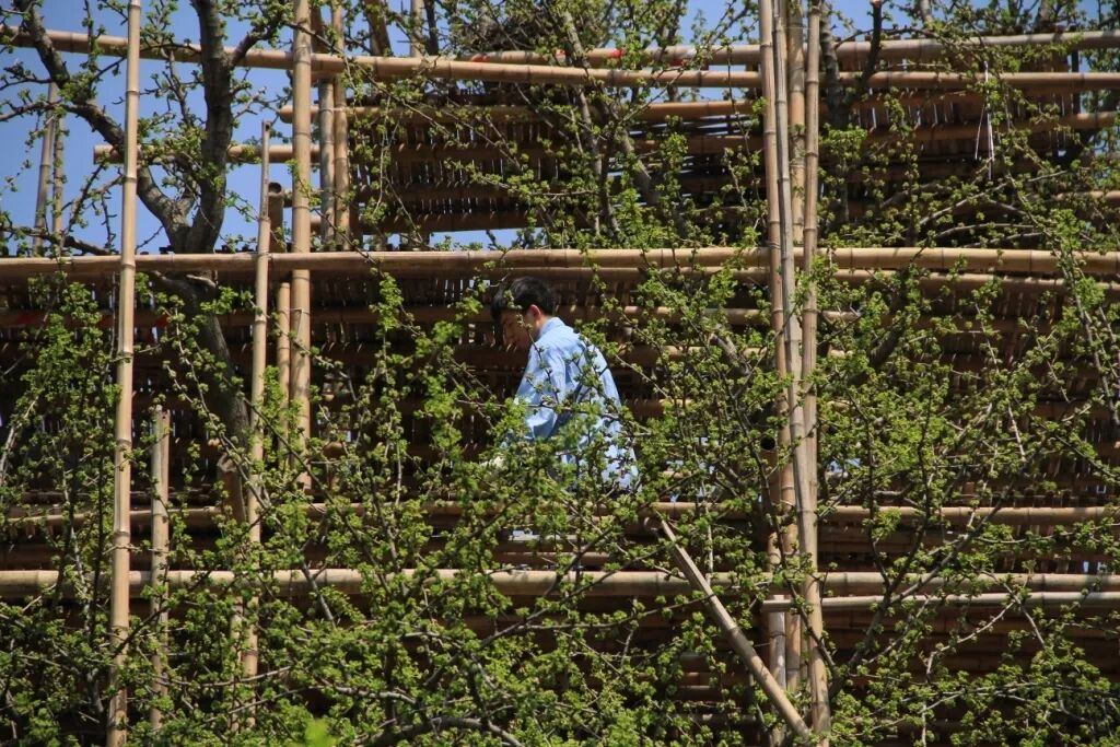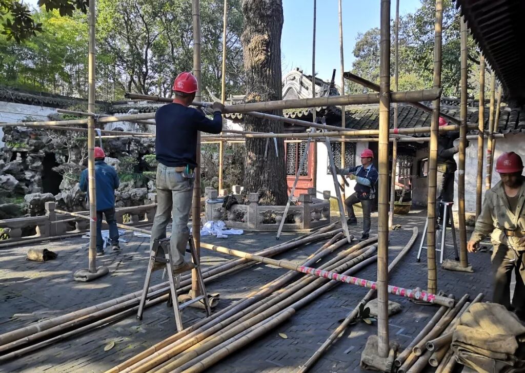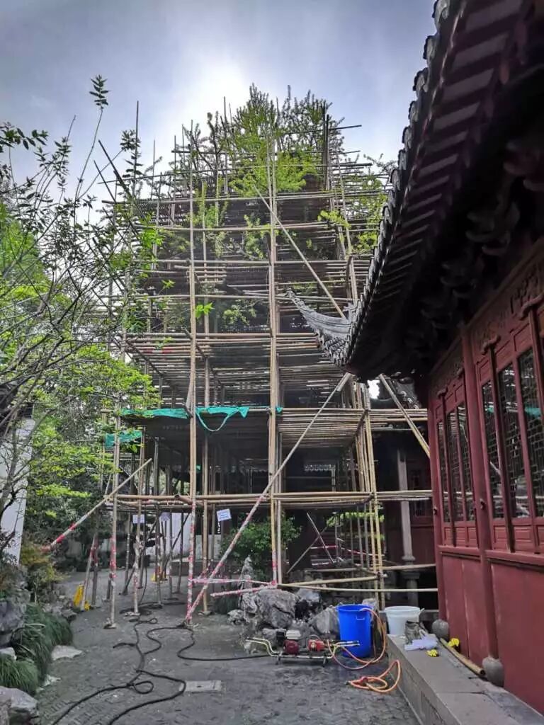 豫园花园先是动用10位工人师傅,花三天时间搭建了两座脚手架,耗材近500根毛竹,体量超4600立方米。