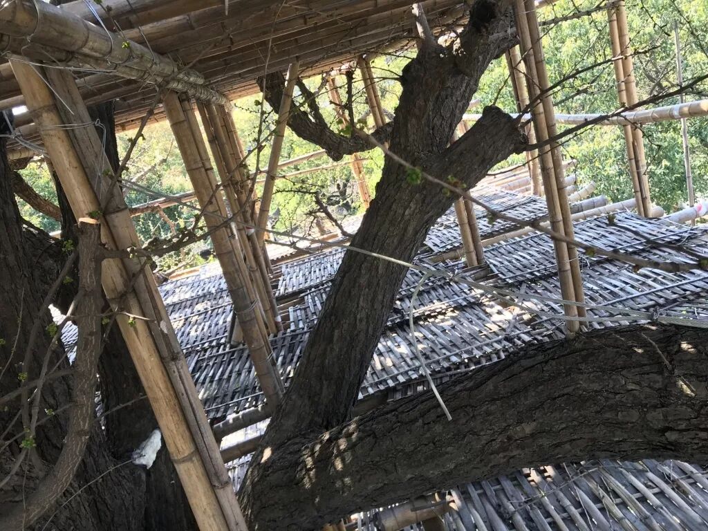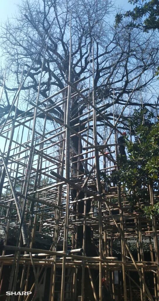 对整个树冠进行疏枝修剪,修剪掉过密枝、病虫枝和安全隐患枝等,控制树型。由下而上,清理树皮,防止百足虫,鼠妇等筑巢,威胁树干健康。应对上海多发的台风天气,加固往年对较长枝干捆绑拉伸的钢索,同时对较粗枝干新添钢丝。