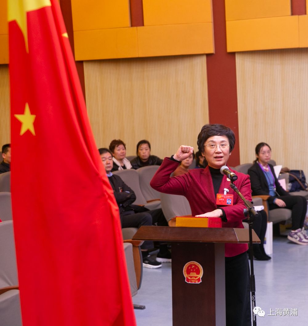 大会举行了宪法宣誓仪式,新当选的黄浦区人大常委会副主任张芹面向国旗庄严宣誓。