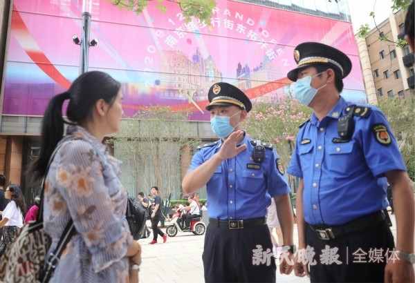 上周五,南京路步行街东拓开街在即,空气里都是喜洋洋的气氛。“活动中,请控制好音响,保证游客耳朵舒适!”大丸百货前,黄浦区人大代表、黄浦城管南京路步行街中队教导员徐智杰和同事正在现场执法,态度语气温厚有力,令人信服,商家音响顿时降了分贝,欢庆环保两不误。