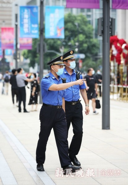 图说:徐智杰(中)和同事在南京东路巡查 新民晚报记者 周馨/摄(下同)