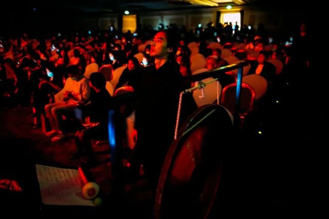 朱慧玲的演唱及十二面大锣和交响乐队的协同演奏,十二锣低吟、狂啸、轰鸣……强烈而震撼的感受直击每个人的心灵。