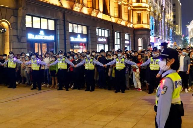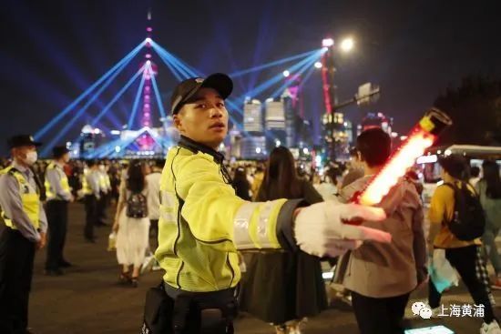 在手牵手疏导外滩大客流的间隙