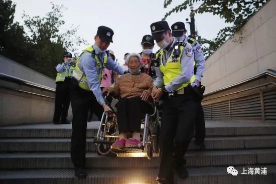 外滩治安派出所民警赵宇敏帮助腿脚不便老人上下扶梯。