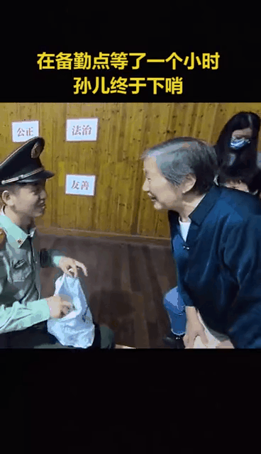 最后,一家人在备勤点合了一张影,圆了奶奶刚才的念想。担心影响孙儿工作,爷爷奶奶很快就离开了。