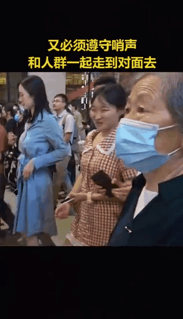 她和人群一起走到对面去