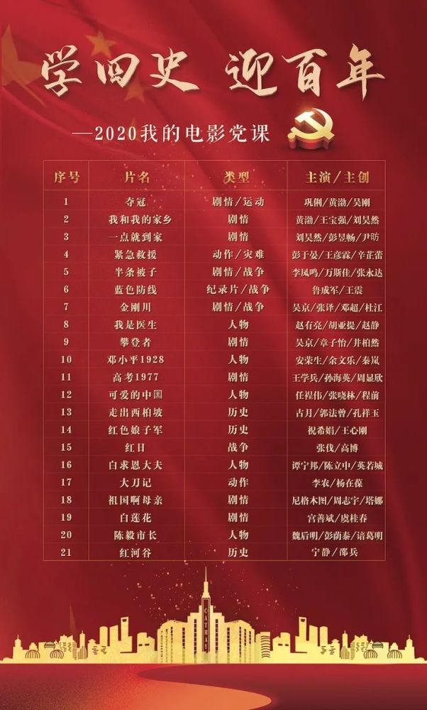 今年共有二十余部影片参与活动,这些影片中既有今年刚刚上映的主旋律佳作,也有历久弥新的经典老片,有描绘我党历史人物的党史影片,有讲述战争硝烟弥漫的解放战争的新中国史影片,有反应改革艰难探索历程的改革开放史影片,也有正面描绘社会主义不断自我完善、自我演进的社会主义发展史影片。片单旨在将“学四史、迎百年”贯彻落实到位,让党课学员们可以在电影中,深刻地学习四史、理解四史。
