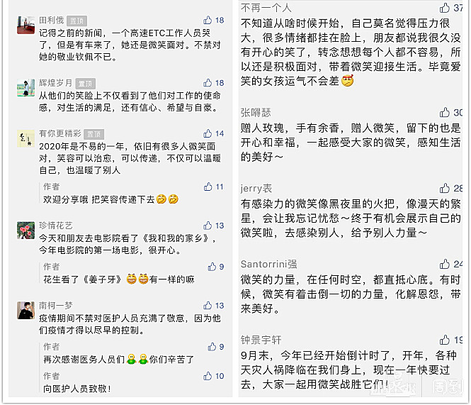 疫情为经济社会按下了片刻的暂停键,却也积蓄着复苏的能量、发展的动力和前行的信念。这9个人用微笑面对不平凡的2020,留下了令人欣喜的闪光瞬间。一时间,新浪微博#美好在黄浦#话题、微信朋友圈被九宫格微笑照刷屏了。网友在微博、朋友圈、自媒体平台上纷纷留言:“从他们的笑脸上,不仅看到了他们对工作的使命感,对生活的满足,还有信心、希望与自豪。”“一张张平凡又温暖的笑脸,装着幸福与耕耘后的收获。”