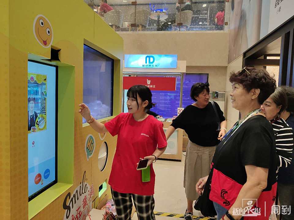 国庆前夕,在南京路东拓段地标新世界大丸百货里,一座亮黄色的“微笑征集站”吸引了来往游客的注意。在工作人员的引导下,游客们轻点屏幕,拍下一张张笑脸照片,传递微笑正能量。“微笑征集站”随机回馈参与者一枚幸运扭蛋,送上一份心意礼物,和参与者交换快乐。