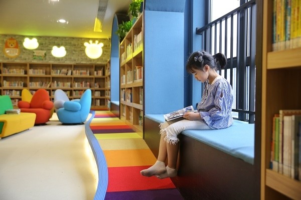 布置温馨的亲子阅览室内,孩子在认真看书。