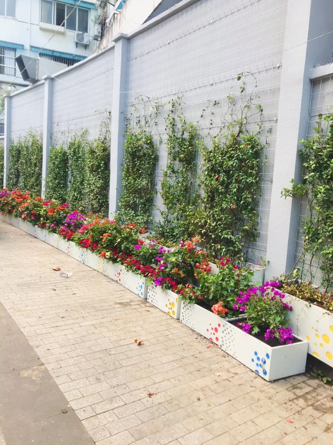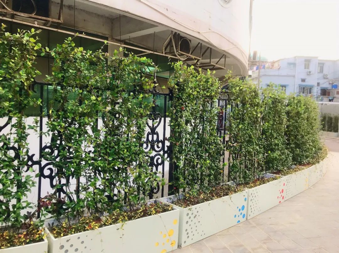 花箱组合内的植物品种以三角梅和凤梨为主体,配以西洋鹃,外侧用花叶蔓、络石等垂吊植物加以装饰,再搭配彩色波点式立体图案的花箱,整体效果凸显新颖时尚、简洁大方。