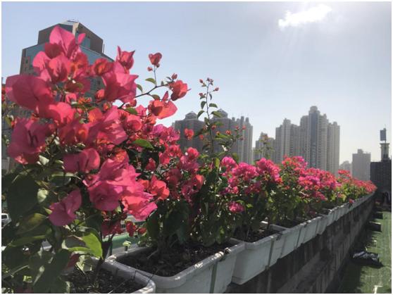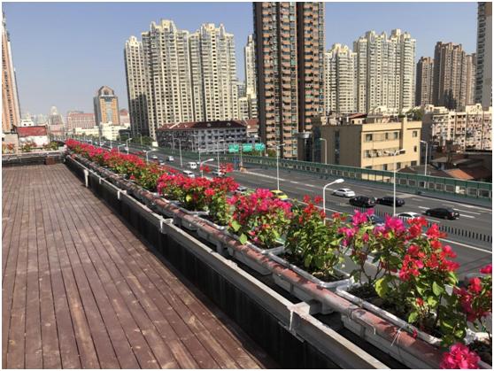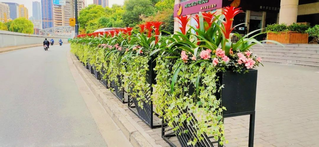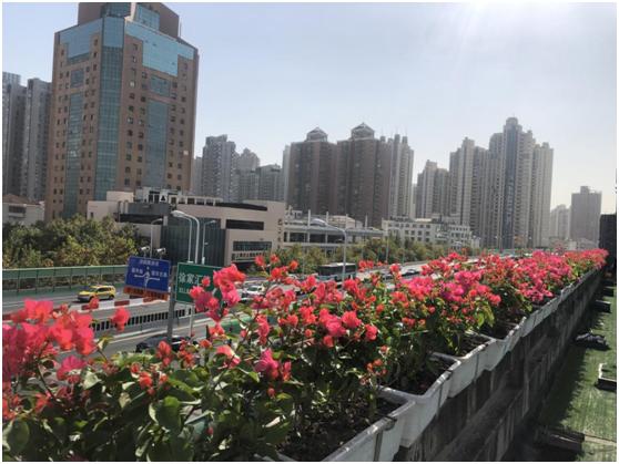 花箱内植物品质主要采用三角梅与常春藤搭配,花色以红色为主色调,更能烘托出“喜迎进博”的气氛。一排排整齐的花箱与车水马龙的南北高架遥相呼应,在钢筋水泥与高楼林立的城市中,匠心打造一处处靓丽的“空中花园”,其景观美不胜收。