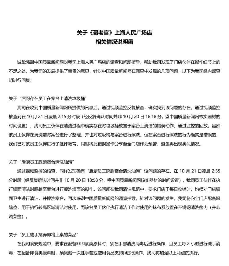 昨夜21时许,《哥老官》针对被曝光的上海人民广场店的情况,逐条进行回复,承认“后厨存在员工在案台上清洗垃圾桶”“后厨员工踩踏案台清洗油污”“地面存放铜壶”的行为确实存在,但否认这些行为发生在傍晚用餐高峰的18点档,而强调发生在深夜或营业收铺后。