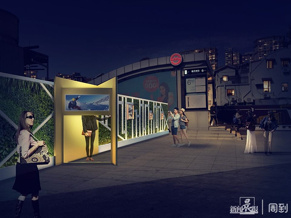 艺术装置“街道匣子”考虑设置在新天地地铁站的出入口。在这个半封闭的独立空间里,既可以展示居民的生活琐碎,也可以作为宣传图册或服务设施的摆放点,人们可以在此驻足、聆听、观看、思索。