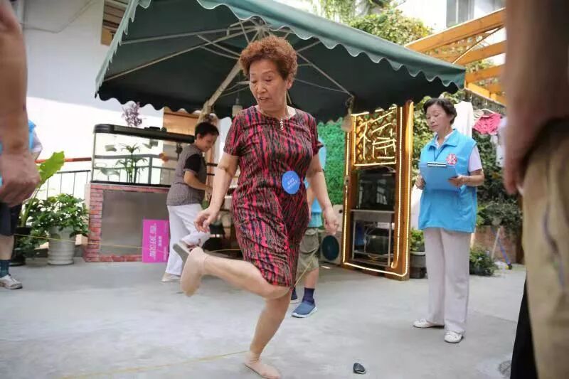 挂着刘大姐赤脚跳皮筋照片的弄堂,位于老西门街道小西门小区里。这堵墙上的照片中,不仅有跳皮筋的刘大姐,还有跳绳子的眼镜爷叔、滚铁圈的中年男子,他们都有一个共同的身份——常住在小西门小区的居民。 讲起照片中的自己,刘大姐很是骄傲,在小西门小区自己组织的社区运动会上,弄堂中的老邻居们各个亮出自小练就的本事。跳皮筋高手刘大姐风采不减当年,矫健的身姿被镜头捕捉了下来。照片中,她脱掉碍事的高跟鞋身姿轻盈,还是当年那个在橡皮筋中翻飞起舞的灵巧姑娘。