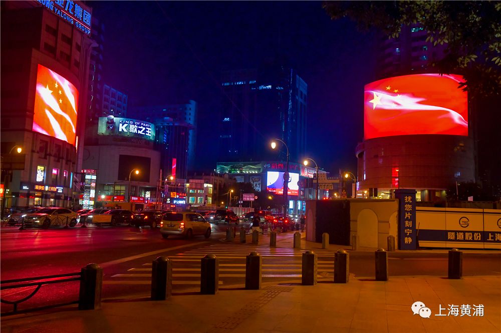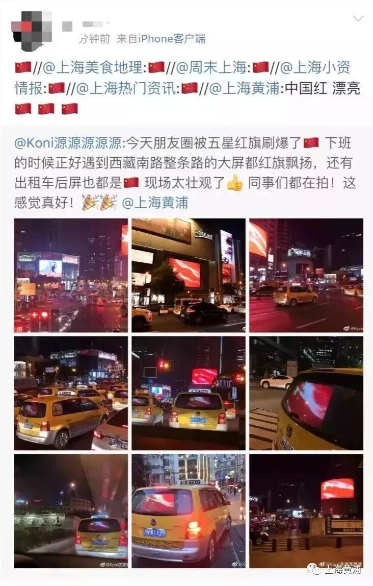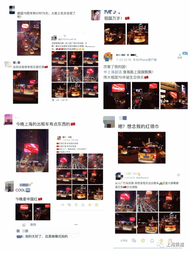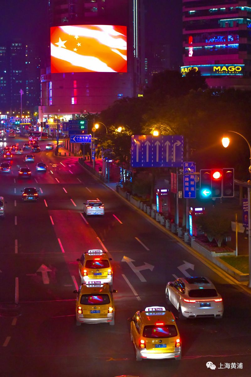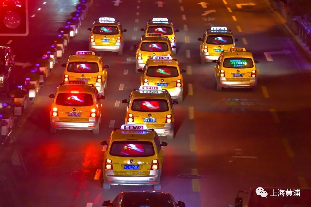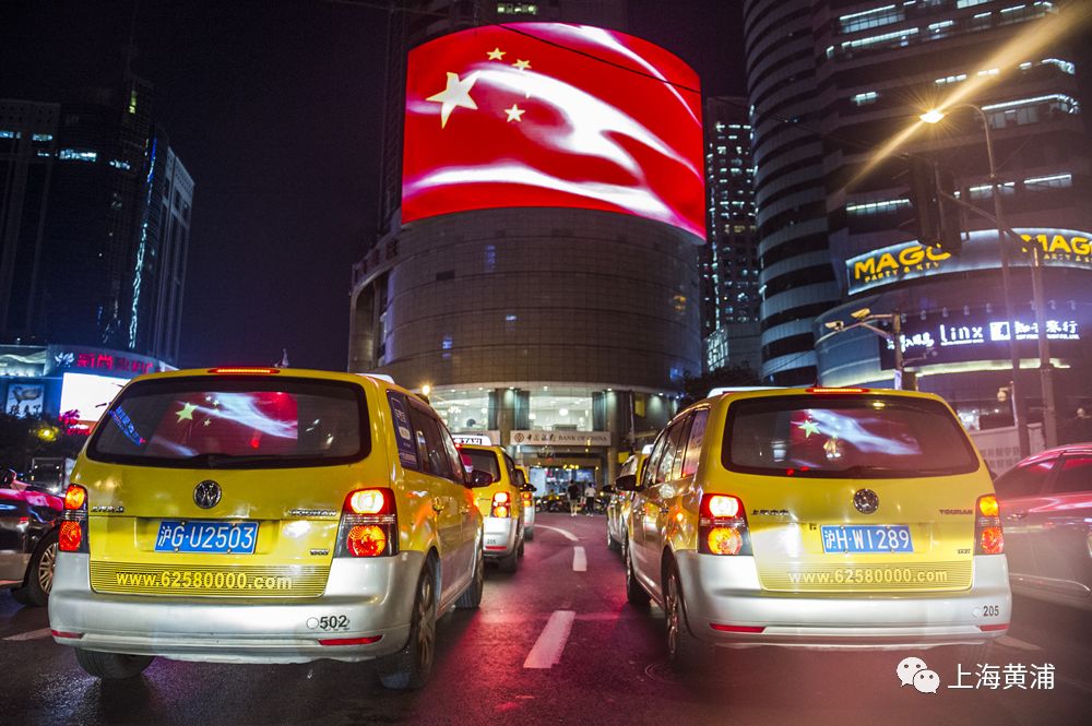 当晚7点半左右,整个上海数万辆出租车的后屏集体“红旗飘飘”,气宇轩昂的五星红旗和夜间灯光交相辉映,一条条繁华的街道如同奔腾不息的红色河流,放眼望去场面蔚为壮观。此外,位于来福士广场、兰生大厦、亚龙广场的三个户外大屏,也闪现了飞扬的巨幅国旗,和出租车流上下呼应,让车水马龙的商业区摇身一变,成为当夜热门的“国之网红”打卡点。
