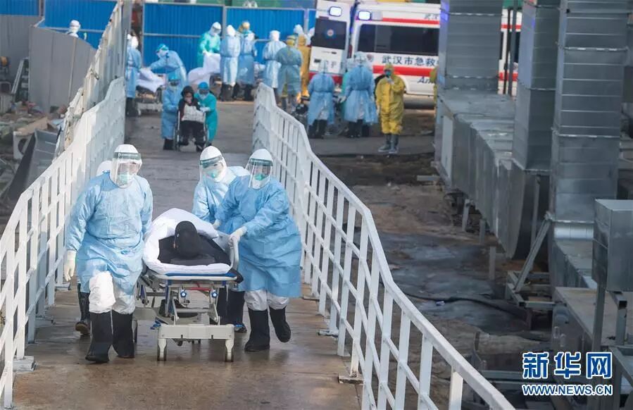 2月4日,医护人员将患者转运至武汉火神山医院病房。新华社记者 肖艺九 摄